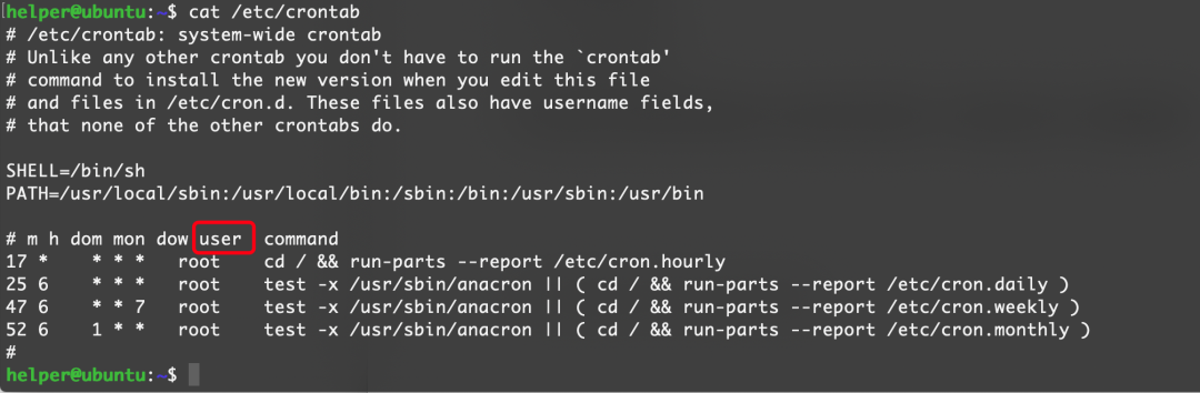 /etc/crontab 这个文件毕竟是用来设置系统日常要用的计划任务,所以呢,会多一个user字段,以满足多用户权限管控的要求
