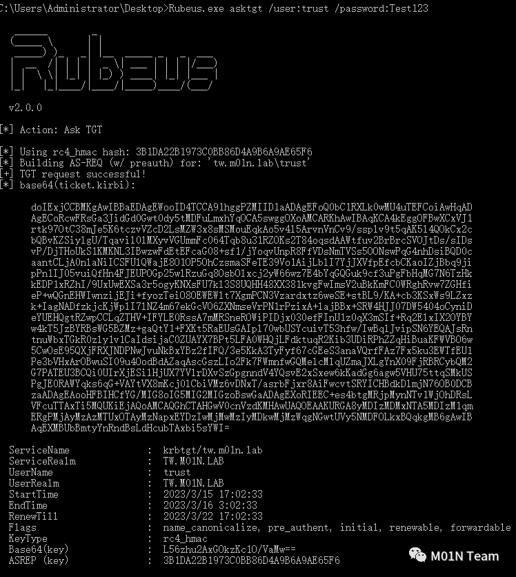 信任票据实际就是一种TGS,因此第一步在子域tw.m01n.lab中使用该域中的账户trust申请TGT。