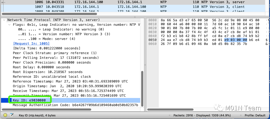 通过Wireshark抓包可以看到NTP包中使用字段Key ID来表示RID。