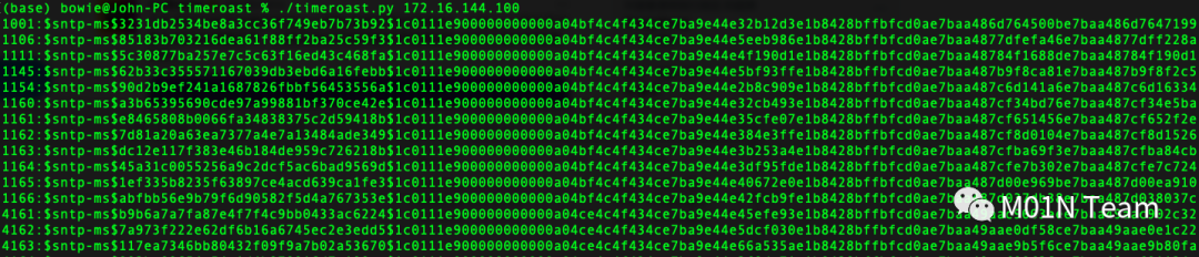 使用工具包中的timeroast脚本指定DC地址,程序会遍历域中的所有计算机账户RID并返回可破解的Hash数据。将程序输出的信息保存到文件中可用于离线破解,目前Hashcat的测试版已经支持该类型的Hash。