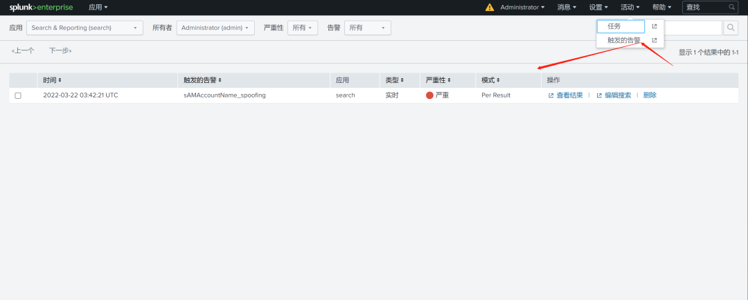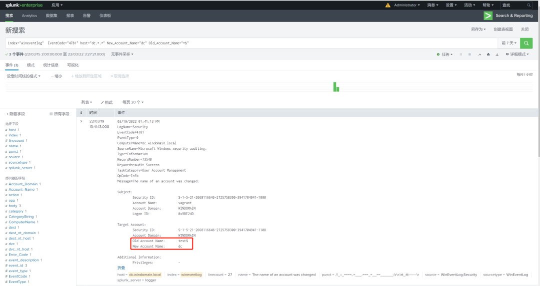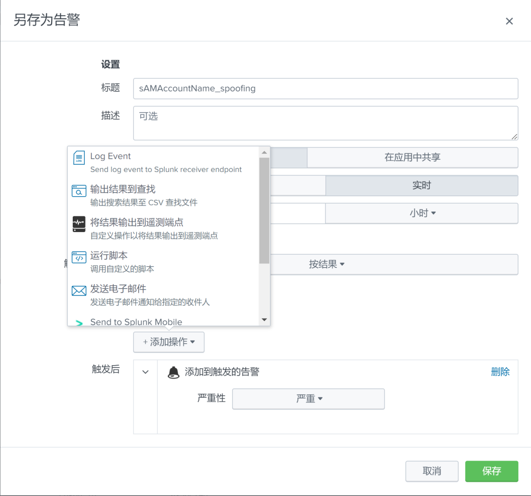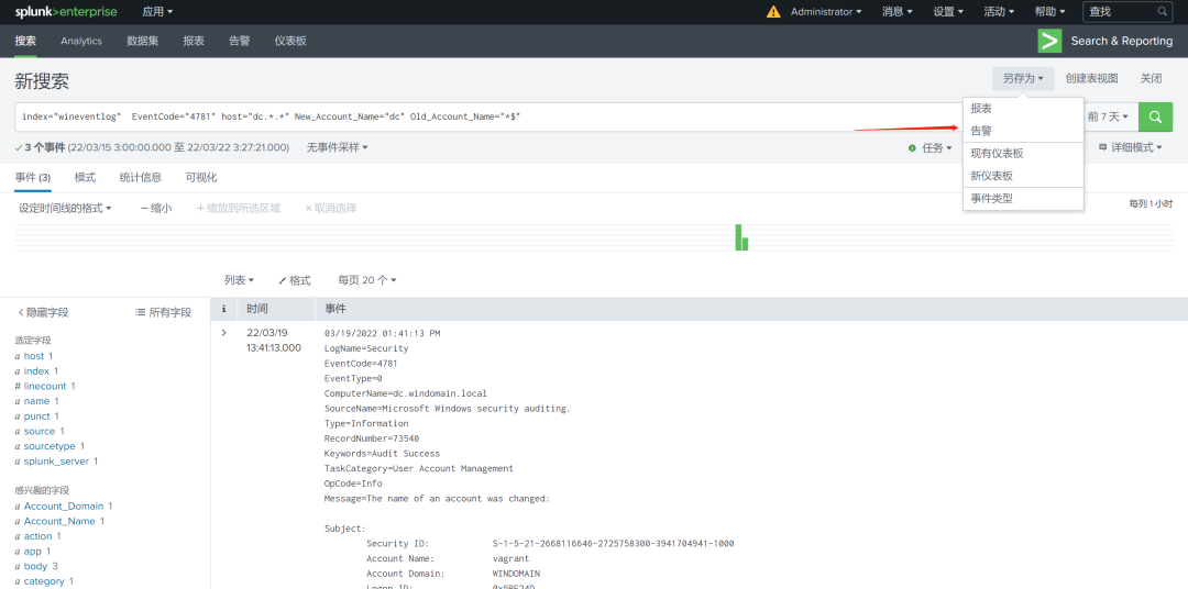 noPac.exe -domain windomain.local -user vagrant -pass vagrant /dc dc.windomain.local /mAccount test -mPassword 12qwAS.. /service cifs /pttindex="wineventlog" EventCode="4781" host="dc.*.*" New_Account_Name="dc" Old_Account_Name="*$"我们可以新建告警,假如有检测出来的我们就可以第一时间了解到