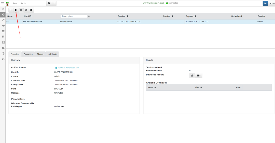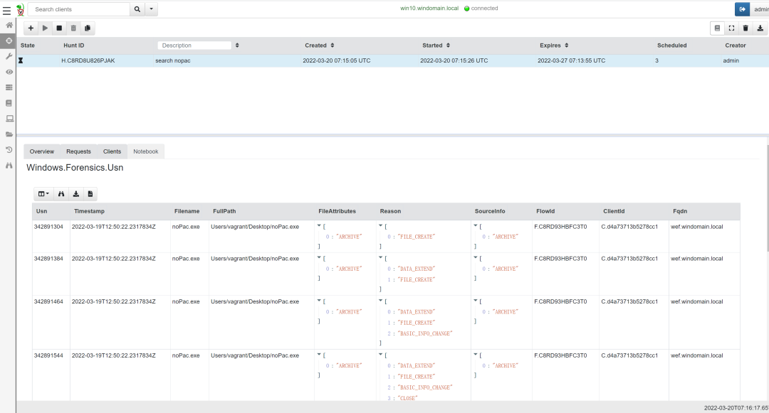 当狩猎完成之后,可在Notebook查看结果,也可下载回来在本地查看,通过结果可以看到noPac.exe创建时间及使用等情况