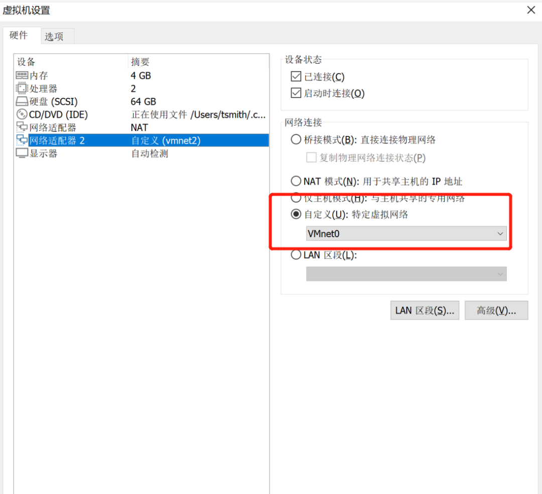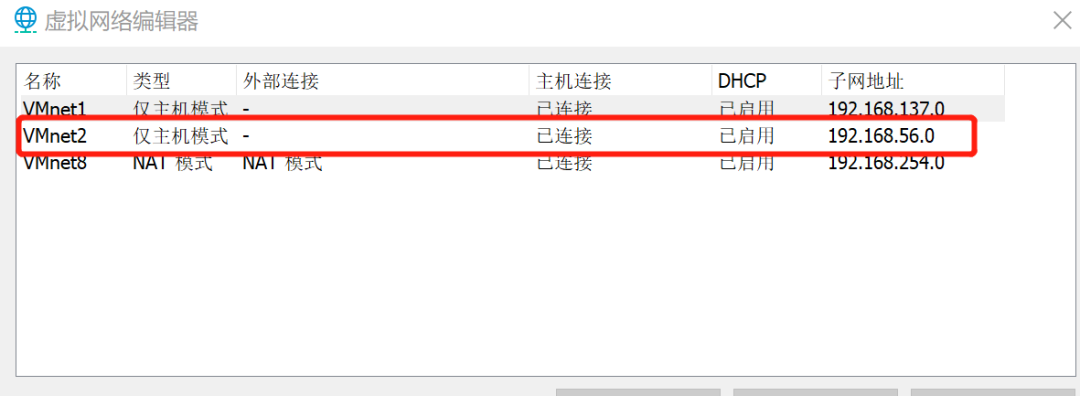 将Vmnet2子网地址设置为192.168.56.0,或者设置vmnet0(虚拟机默认网卡是vmnet0)