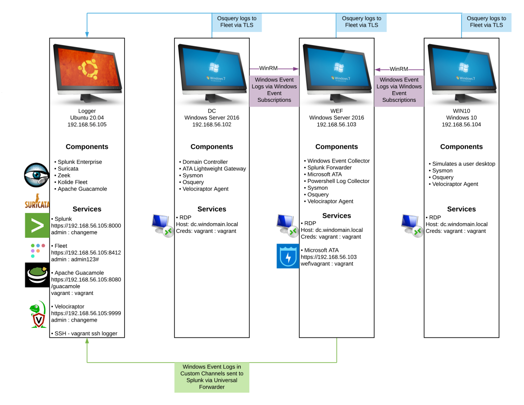 Domain Name: windomain.localAdmininstrator login: vagrant:vagrantFleet login: https://192.168.56.105:8412 - admin@detectionlab.network:admin123#Splunk login: https://192.168.56.105:8000 - admin:changemeMS ATA login: https://192.168.56.103 - wef\vagrant:vagrantGuacamole login: http://192.168.56.105:8080/guacamole - vagrant:vagrantVelociraptor login: https://192.168.56.105:9999 - admin:changeme