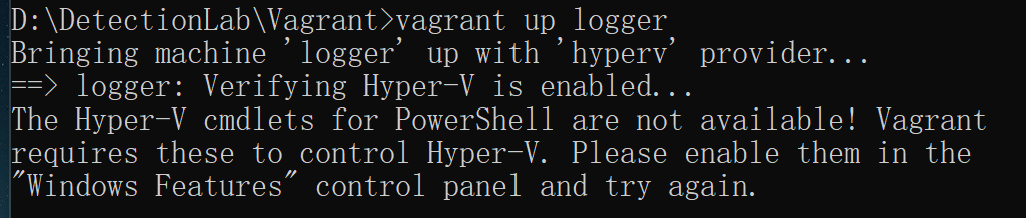 vagrant provision loggervagrant plugin install vagrant-reload4.The Hyper-V cmdlets for PowerShell are not available
