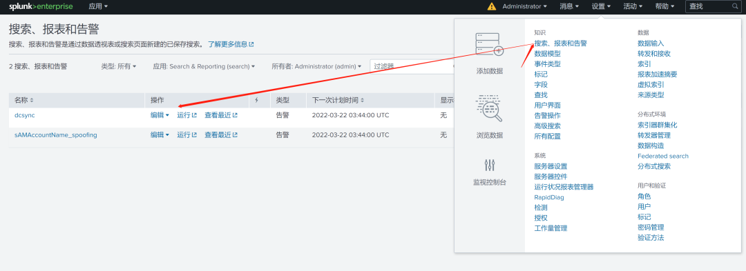 可在设置-->知识-->搜索、报表和告警处进行修改所添加的告警