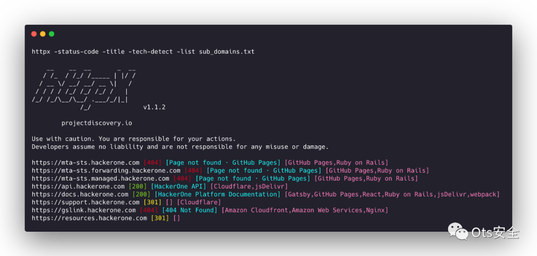 subfinder -d hackerone.com -silent| httpx -title -tech-detect -status-code__ __ __ _ __/ /_ / /_/ /_____ | |/ // __ \/ __/ __/ __ \| // / / / /_/ /_/ /_/ / |/_/ /_/\__/\__/ .___/_/|_|/_/ v1.1.1projectdiscovery.ioUse with caution. You are responsible for your actionsDevelopers assume no liability and are not responsible for any misuse or damage.https://mta-sts.managed.hackerone.com [404] [Page not found · GitHub Pages] [Varnish,GitHub Pages,Ruby on Rails]https://mta-sts.hackerone.com [404] [Page not found · GitHub Pages] [Varnish,GitHub Pages,Ruby on Rails]https://mta-sts.forwarding.hackerone.com [404] [Page not found · GitHub Pages] [GitHub Pages,Ruby on Rails,Varnish]https://docs.hackerone.com [200] [HackerOne Platform Documentation] [Ruby on Rails,jsDelivr,Gatsby,React,webpack,Varnish,GitHub Pages]https://support.hackerone.com [301,302,301,200] [HackerOne] [Cloudflare,Ruby on Rails,Ruby]https://resources.hackerone.com [301,301,404] [Sorry, no Folders found.]