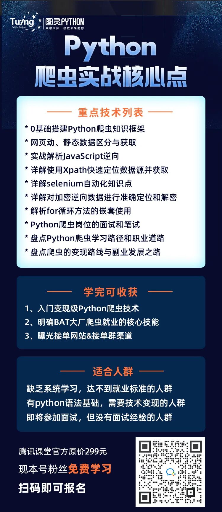 这是一套专讲Python爬虫与爬虫兼职的实战课程,将由数据竞赛获奖大佬亲身指导,带领大家进行前沿技术理论+副业项目实战的综合技术速成训练!