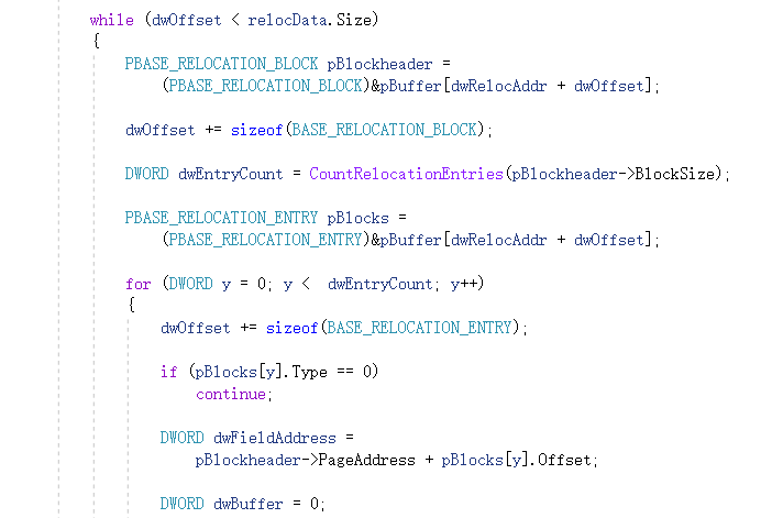 之后使用VirtualAllocEx相关api在子进程申请空间,然后将payload的头及每个节复制到子进程中,并若payload的基址和子进程的基址不相等则重定位处理: