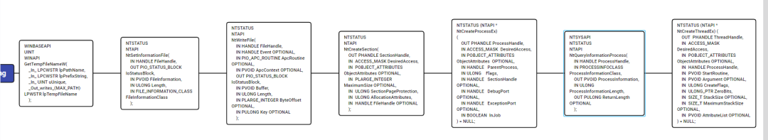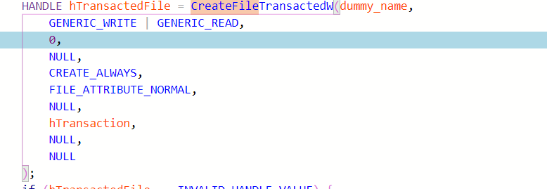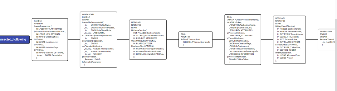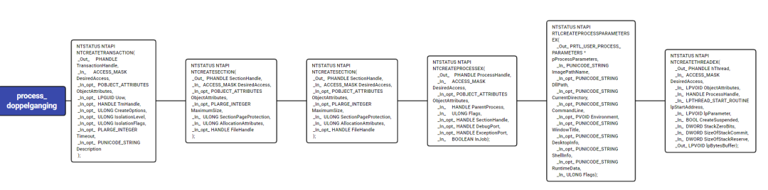 Process doppelganging(进程分身),在近几年提出的注入手法,其主要原理是:通过NtCreateTransaction函数创建一个事务句柄,再传入事务句柄去CreateFileTransactedW创建一个文件流句柄,然后通过writefile往文件流句柄写入数据,接着通过传入文件流句柄调用NtCreateSection获得section,最后调用NtRollbackTransaction回滚: