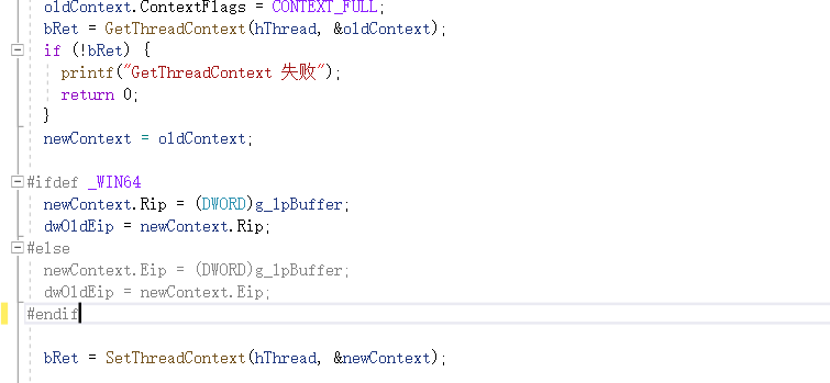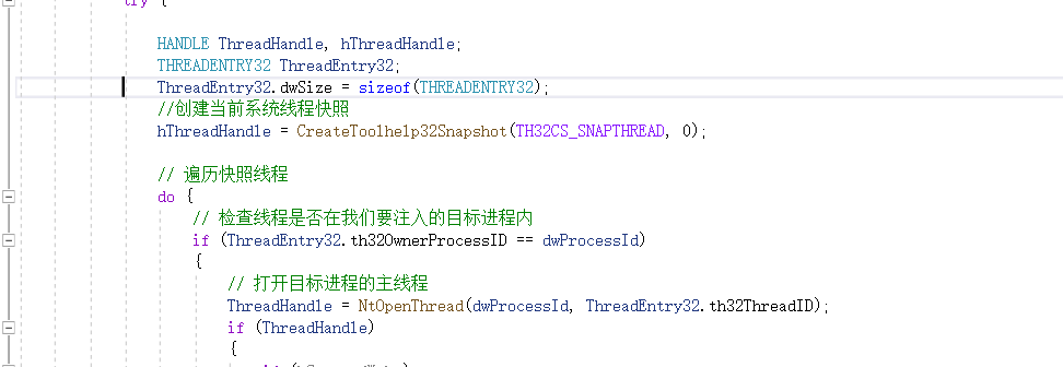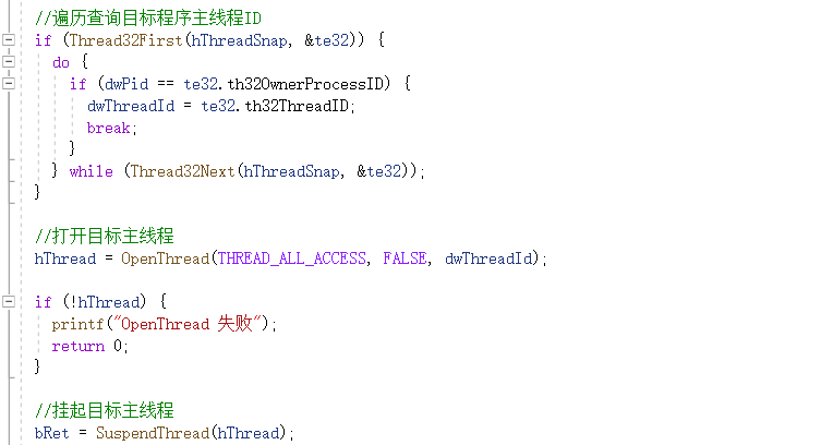 前面获得句柄的操作与2.2经典注入一样,差异部分在于通过获得目标进程的主线程并将其暂停,如下图: