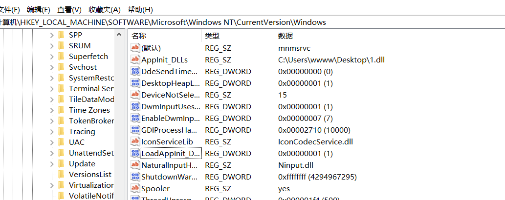 在注册表中存在以下两项,计算机\HKEY_LOCAL_MACHINE\SOFTWARE\Microsoft\Windows NT\CurrentVersion\Windows的AppInit_DLLs键值为DLL的路径,LoadAppInit_DLL的键值为1。