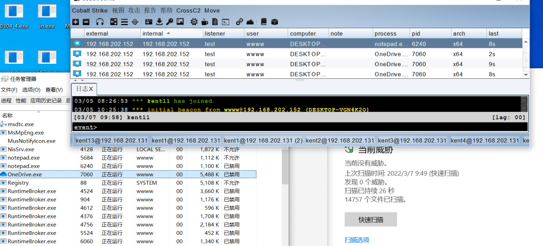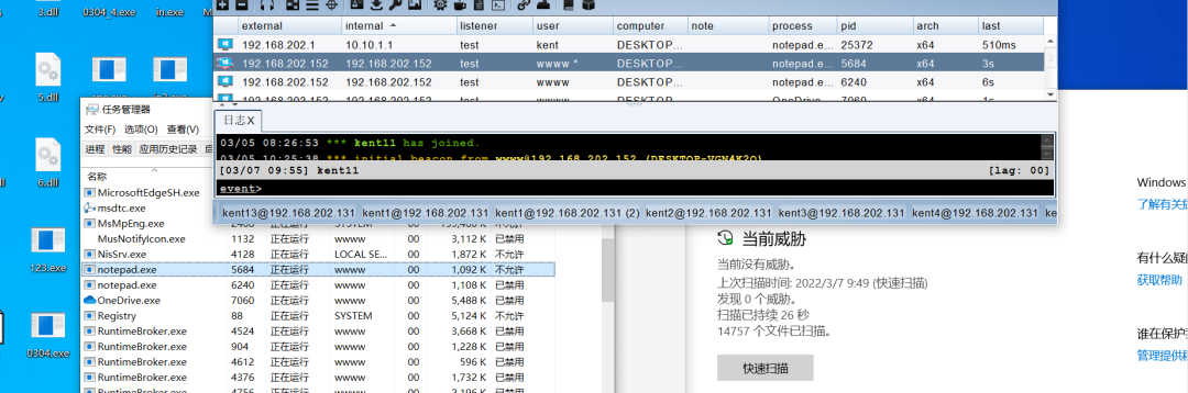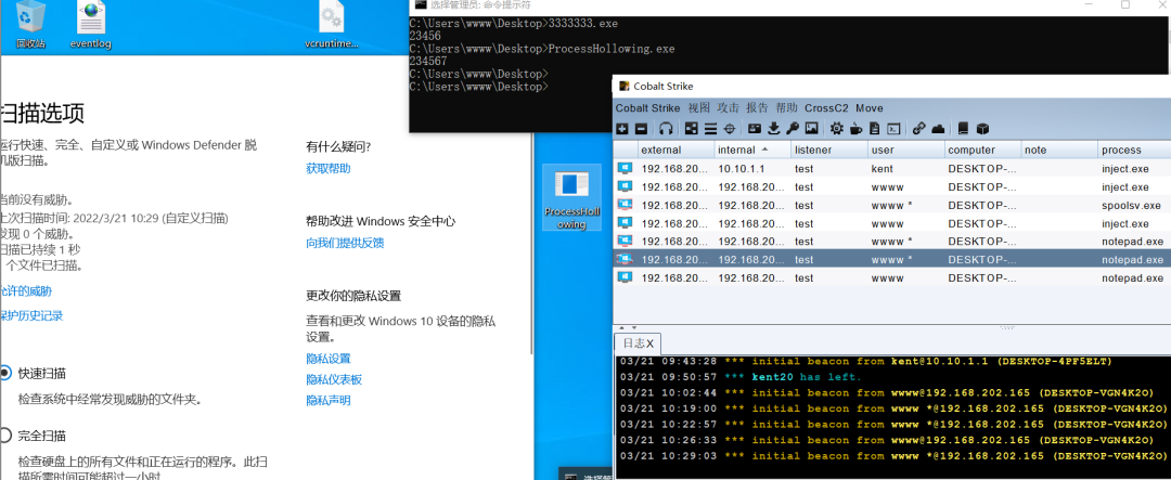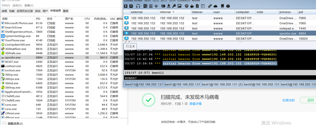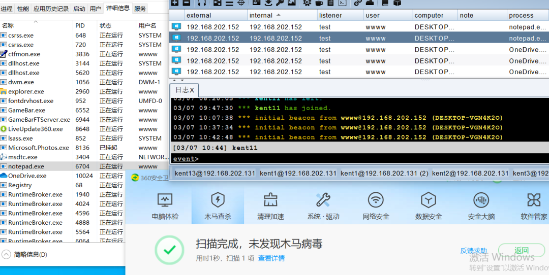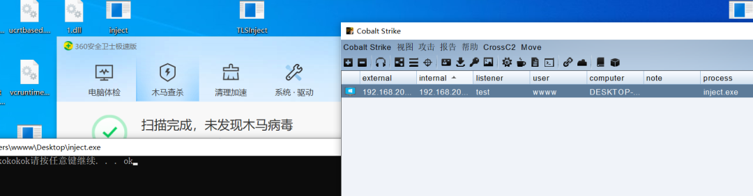 如果使用TLS注入其他进程需要跟其他手法结合,下面是360和WD的测试,360能正常上线: