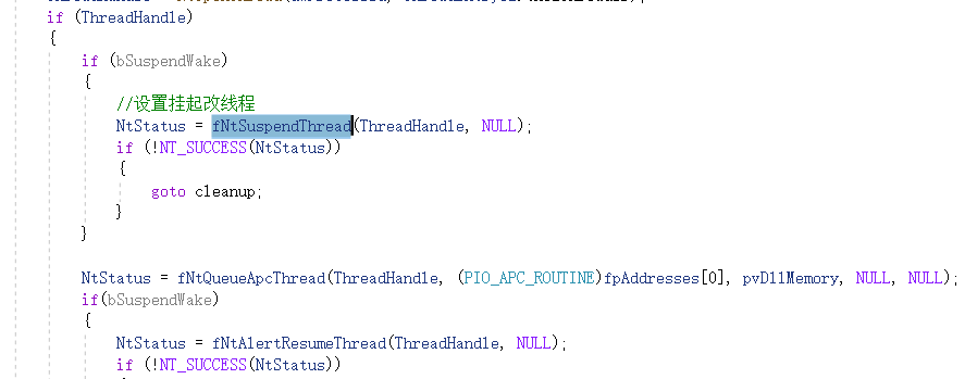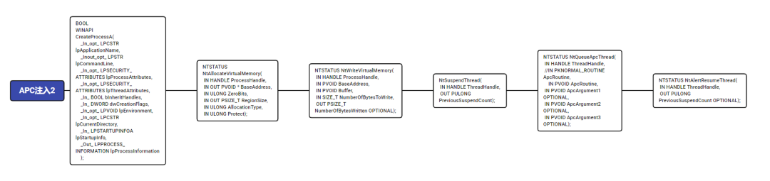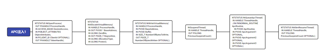 然后调用NtSuspendThread挂起该进程—> NtQueueApcThread往APC队列插入回调的函数地址和参数 NtAlertResumeThread 恢复挂起的线程运行。