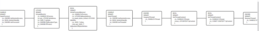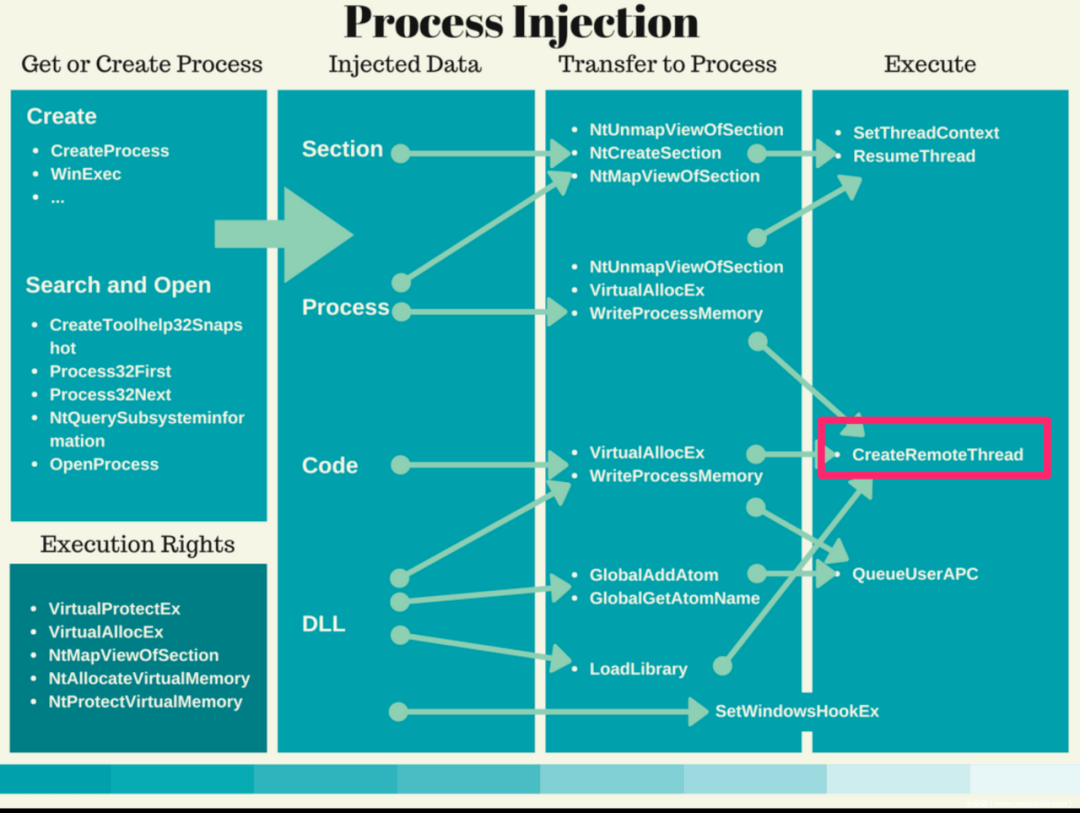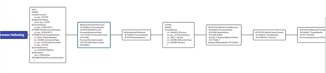 在T1055战术中的Windows注入演变出越来越多得方式,但相关的API调用可以总结为下图: