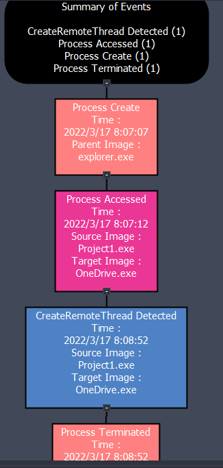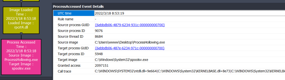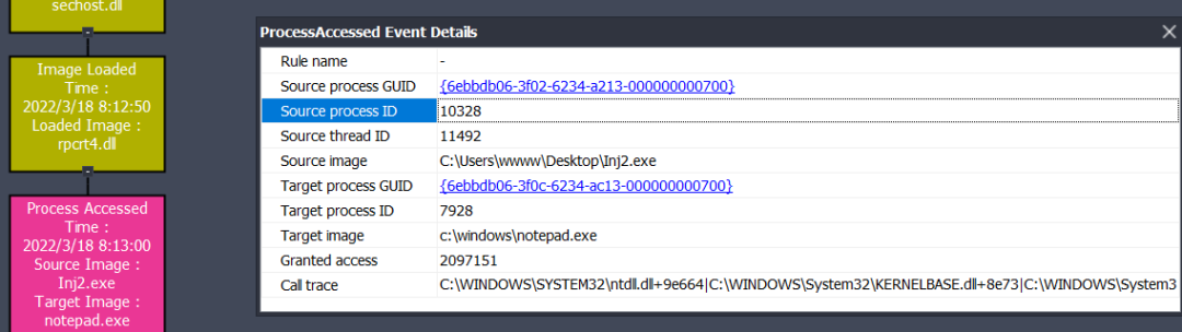 T1055.001可以通过数据源DS0011(模块)与DS0009(进程)进行检测,而T1055.002少调用了Loadlibrary函数只有通过DS0009(进程)去检测,我们可以通过其调用链(Process Create 启动进程 Process Accessed 获得句柄CreateRemoteThread注入)比较直观的看到其行为: