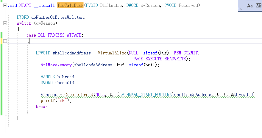在TLS中可以直接执行shellcode,也可以结合其他手段(进程镂空、经典注入等)注入相关进程中。