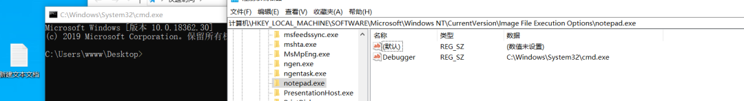 映像劫持是通过篡了注册表HKEY_LOCAL_MACHINE\SOFTWARE\Microsoft\Windows NT\CurrentVersion\Image File Execution Options中的键值实现的,例如这里有notepad.exe项,再在这子项里新建一个REG_SZ类型的名字为Debugger键,内容为cmd.exe的值项。这样就轻易的实现映像劫持,当每次运行notepad.exe时都会运行cmd.exe程序。
