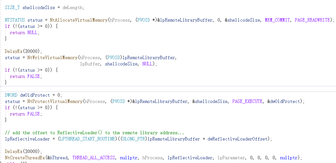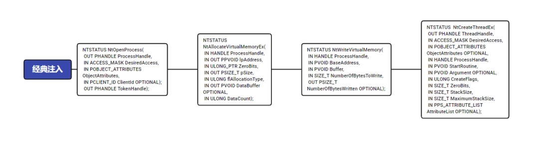 NtAllocateVirtualMemory在目标进程创建内存空间 NtWriteVirtualMemory 在所分配的内存空间写入payloadNtCreateThreadEx创建线程执行。