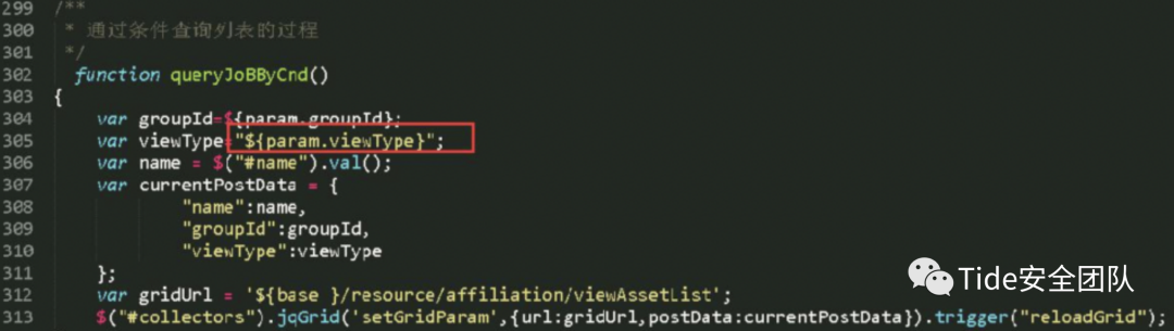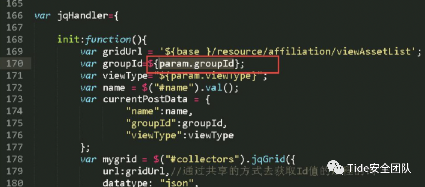 此段代码中第170行、305行获取请求参数中的groupId值,在未经检查参数合法性的情况下输出在javascript代码中,造成反射型XSS漏洞。