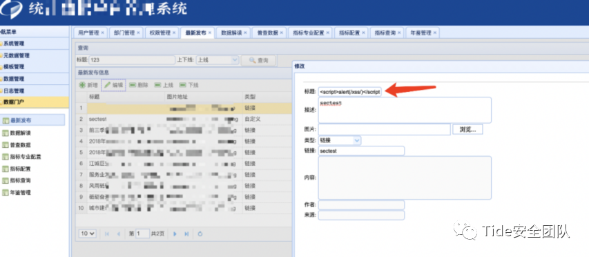 在标题处处输入测试代码<script>alert(/XSS/)</script>,页面出现弹窗,点击别的功能模块后再次返回此页面,依旧弹窗,所以此网站存在存储型XSS漏洞。