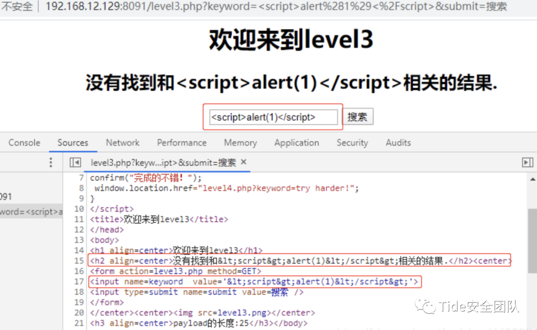 访问网页,打开浏览器的开发者工具,查看到代码中对尖括号和双引号:>、<、"进行了过滤,但没有过滤'(单引号)。