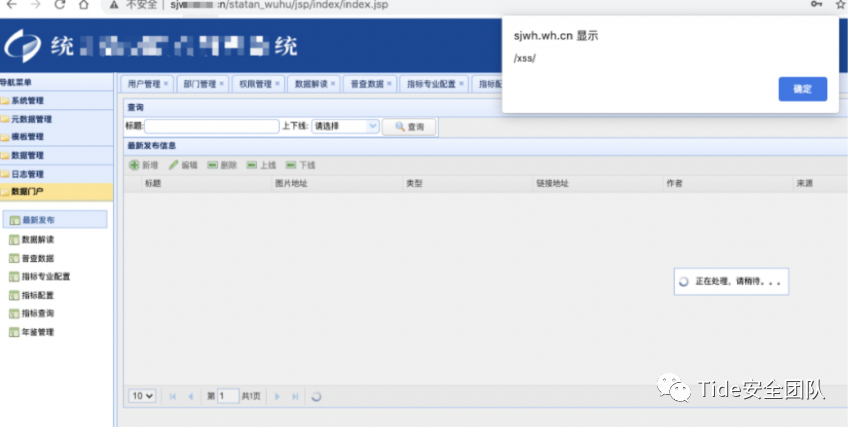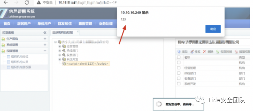 在机构名称处输入测试代码<script>alert(1)</script>,页面出现弹窗,证明XSS语句已被执行,此网站存在XSS漏洞。
