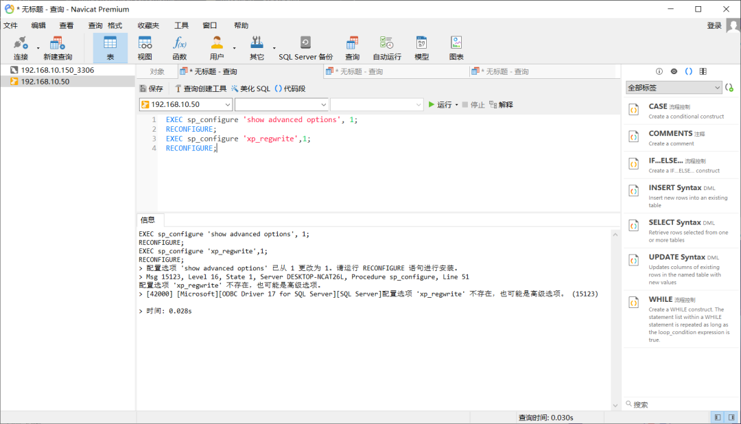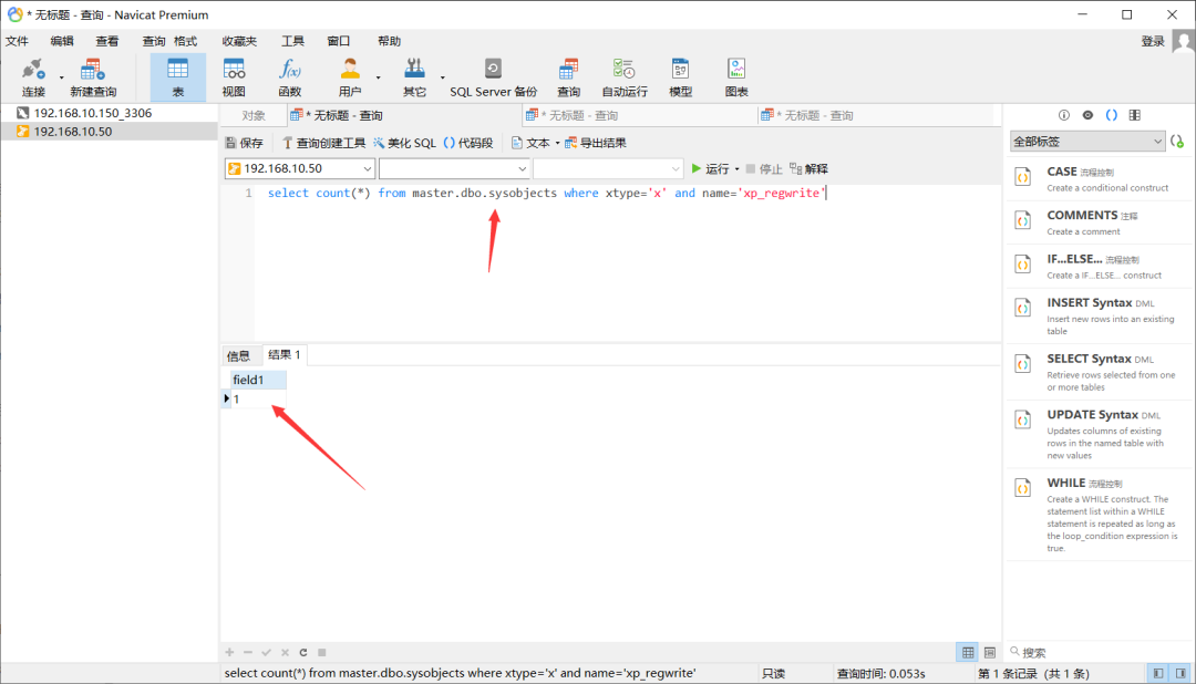 select count(*) from master.dbo.sysobjects where xtype='x' and name='xp_regwrite'我这里已经开启了,就出现报错了,之前我试了一下关闭,好像还是报错,不过默认情况下好像是开启的。