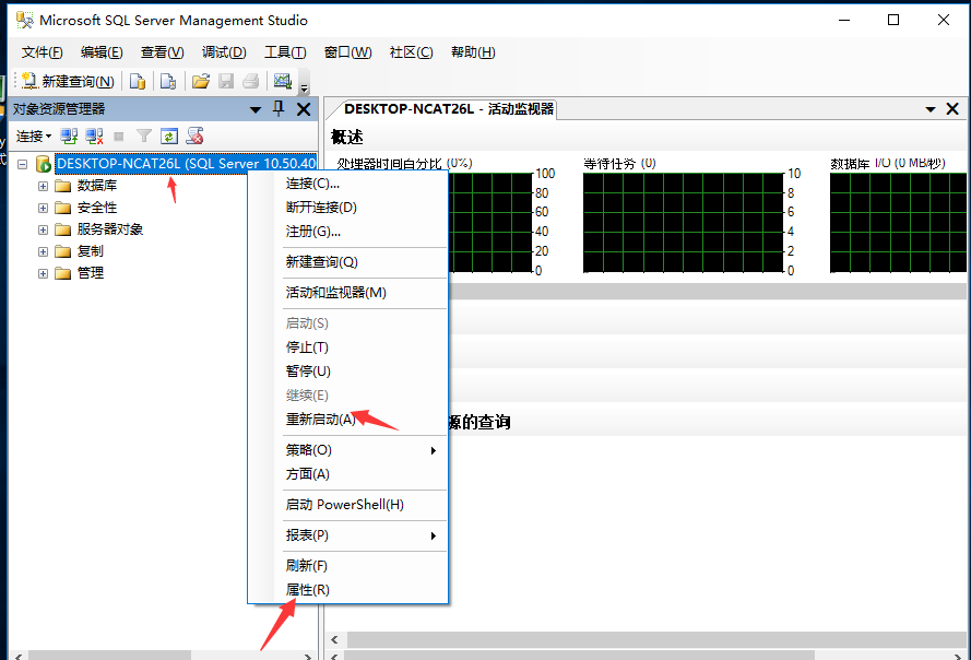 这里我们在刚刚连接进去的页面中,右击数据库,点击"属性",点进去后,直接点击确定,不需要点击其它的,然后重启数据库。