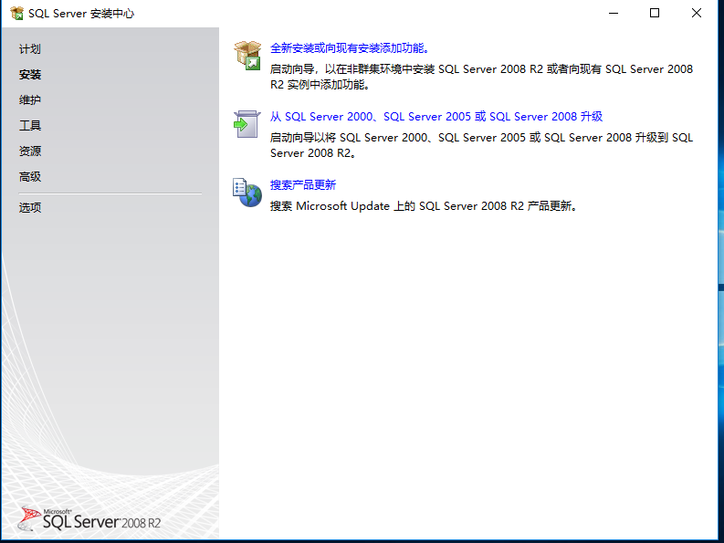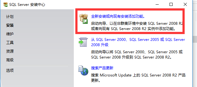 双击打开SQL EXPR文件,这里需要稍等一会, 就会出现下面的界面。点击“全新安装或向现有安装添加功能”。