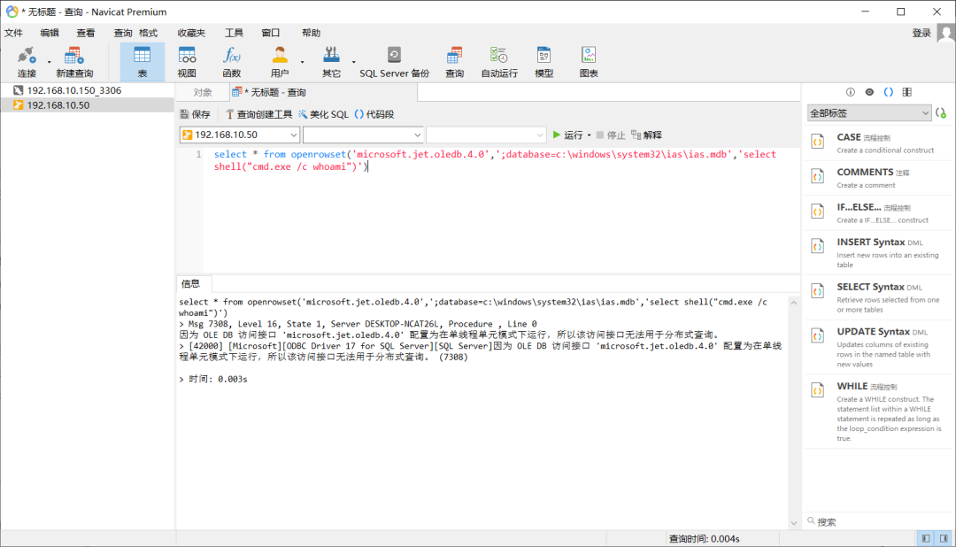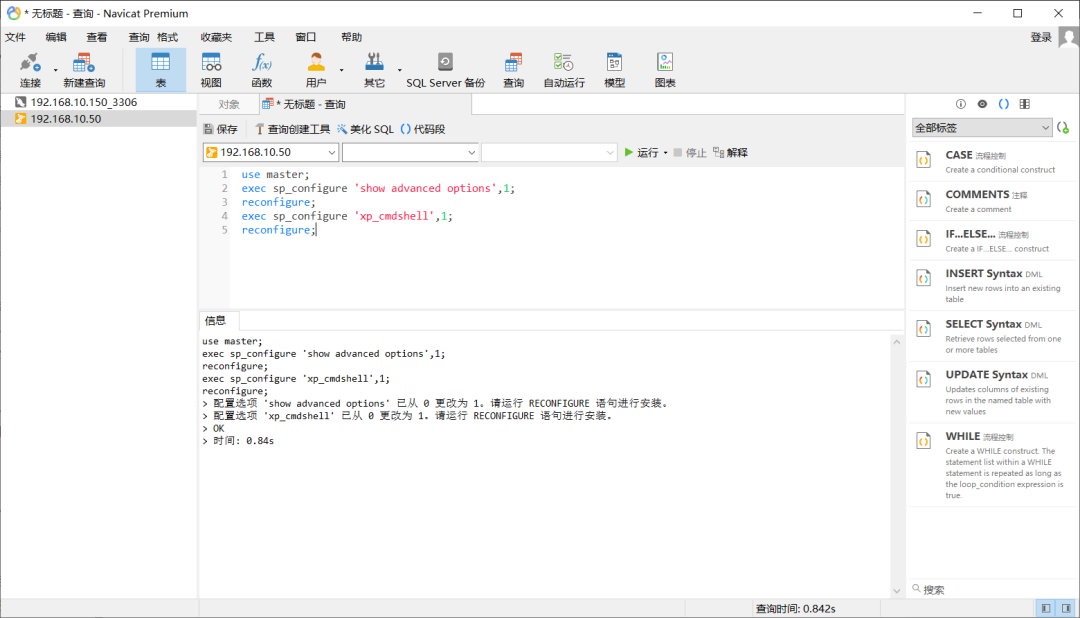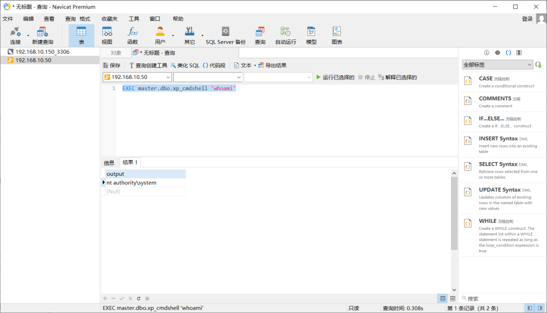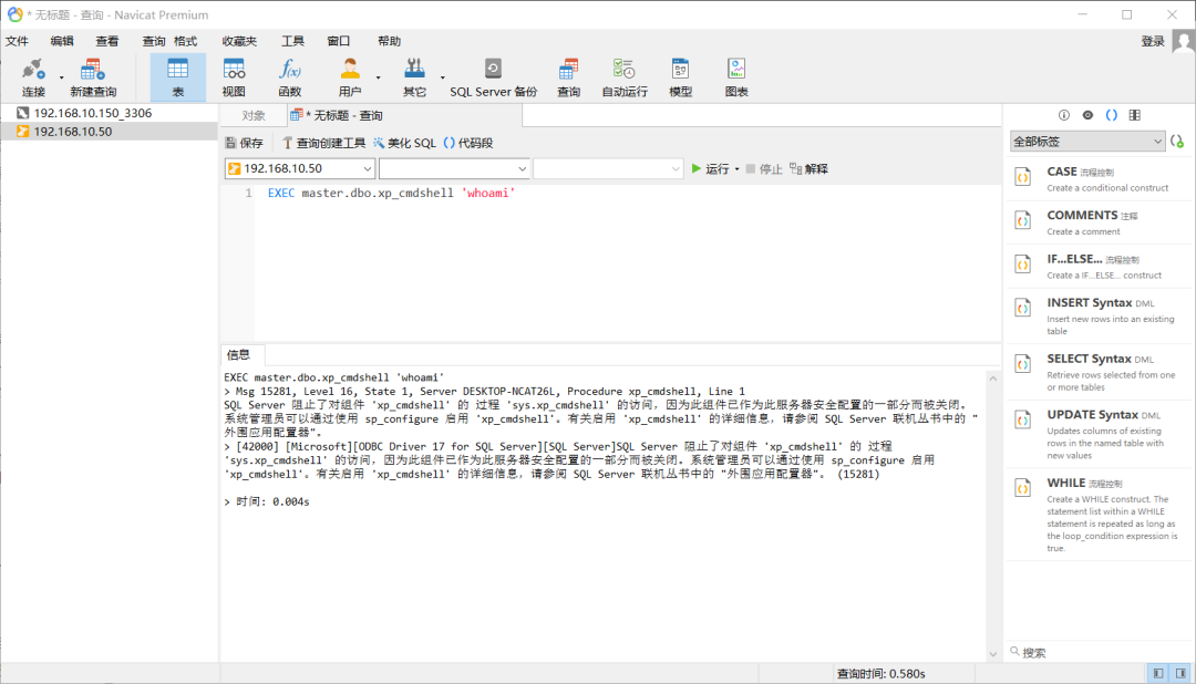 EXEC master.dbo.xp_cmdshell 'whoami'这里通过使用命令开启xp_cmdshell即可。