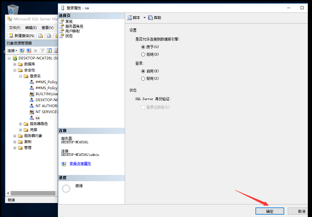 这里设置一下外联,我们点击最后一个属性,也就是状态属性(Status),在这个状态栏中,我们只需要勾选上面一栏是否允许连接到数据库引擎(Permission to connect to database engine) 选择 grant(授予);