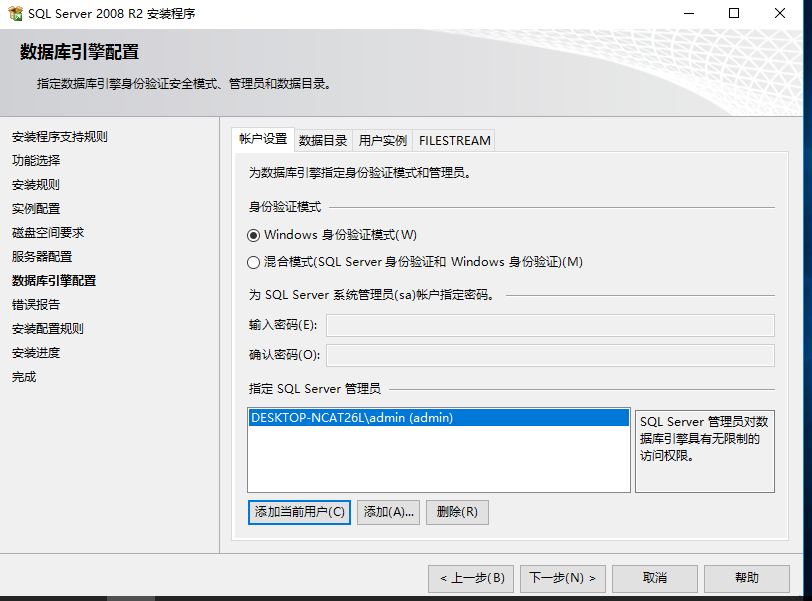 点击“添加当前用户”,会自动添加当前用户,正常到这个页面默认就会选择当前用户,然后下一步,这里可能会遇到错误报告,不用管,直接下一步。