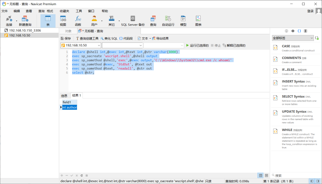 EXEC master.dbo.xp_cmdshell 'whoami'在xp_cmdshell被删除或不能利用是可以考虑利用sp_oacreate,利用前提需要sqlserver sysadmin账户服务器权限为system。sp_oacreate 是一个存储过程,可以删除、复制、移动文件,还能配合 sp_oamethod 来写文件执行系统命令。