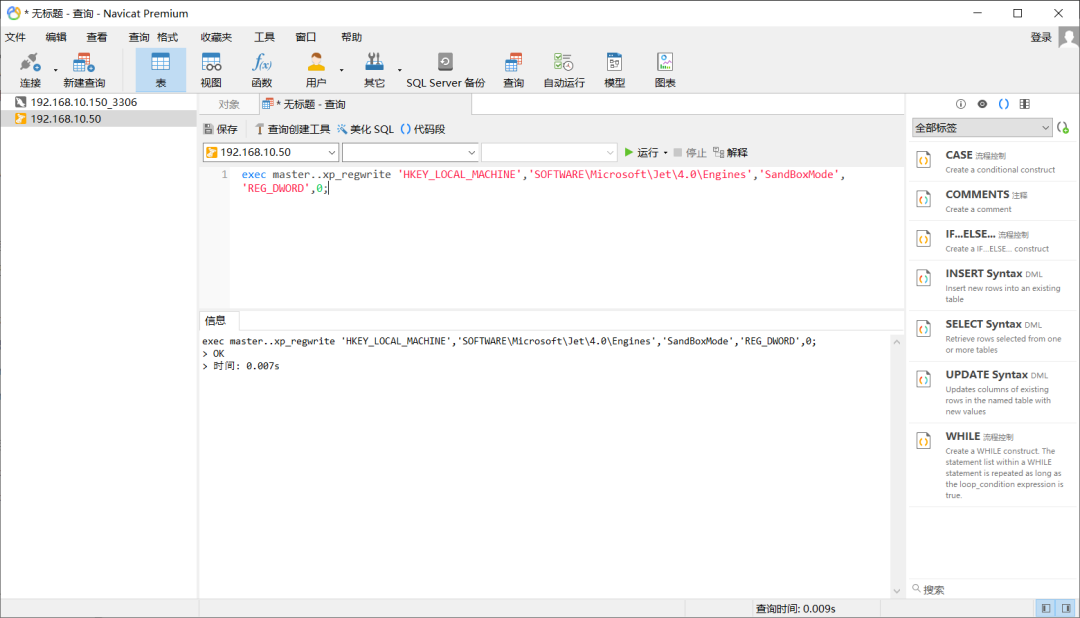关闭:exec master..xp_regwrite 'HKEY_LOCAL_MACHINE','SOFTWARE\Microsoft\Jet\4.0\Engines','SandBoxMode','REG_DWORD',0;恢复:exec master..xp_regwrite 'HKEY_LOCAL_MACHINE','SOFTWARE\Microsoft\Jet\4.0\Engines','SandBoxMode','REG_DWORD',2;