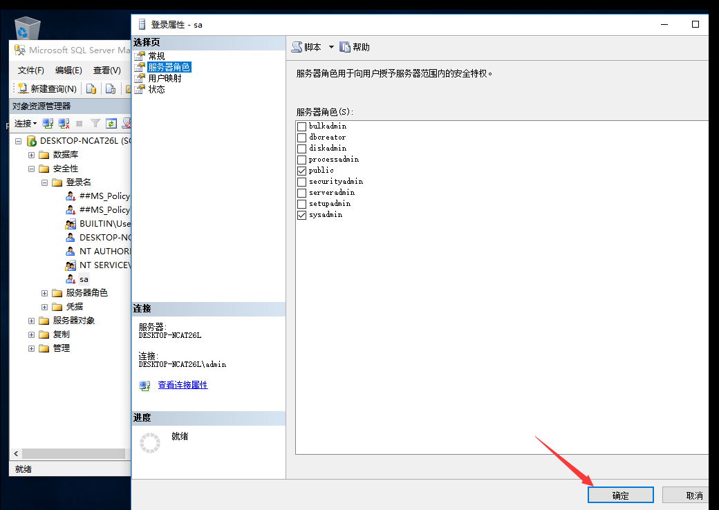 还是在sa用户那个设置的页面中,设置一下权限,点击左上角的第二个属性服务器角色(server roles),这里是你为添加该用户要实现哪些角色。一般我们自己使用都是配置最高权限的角色,一个是public ,还有一个是sysadmin。