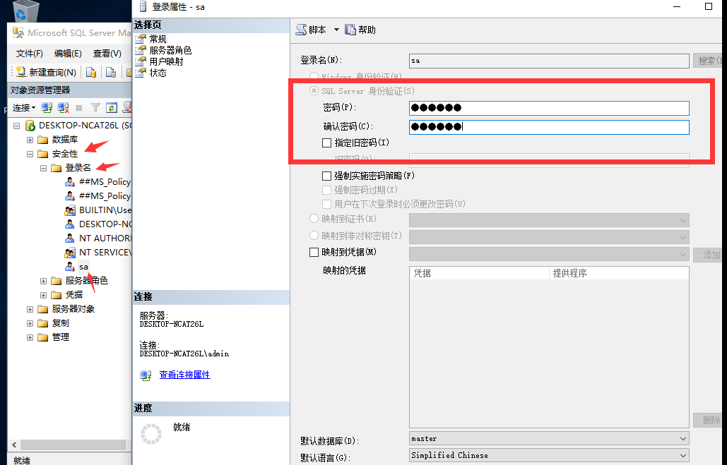 点击“安全性”“登录名”找到“SA”设置这个用户的密码。