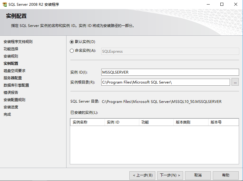 这里默认是选在命名实例,这里我们修改位默认实例,然后下一步。