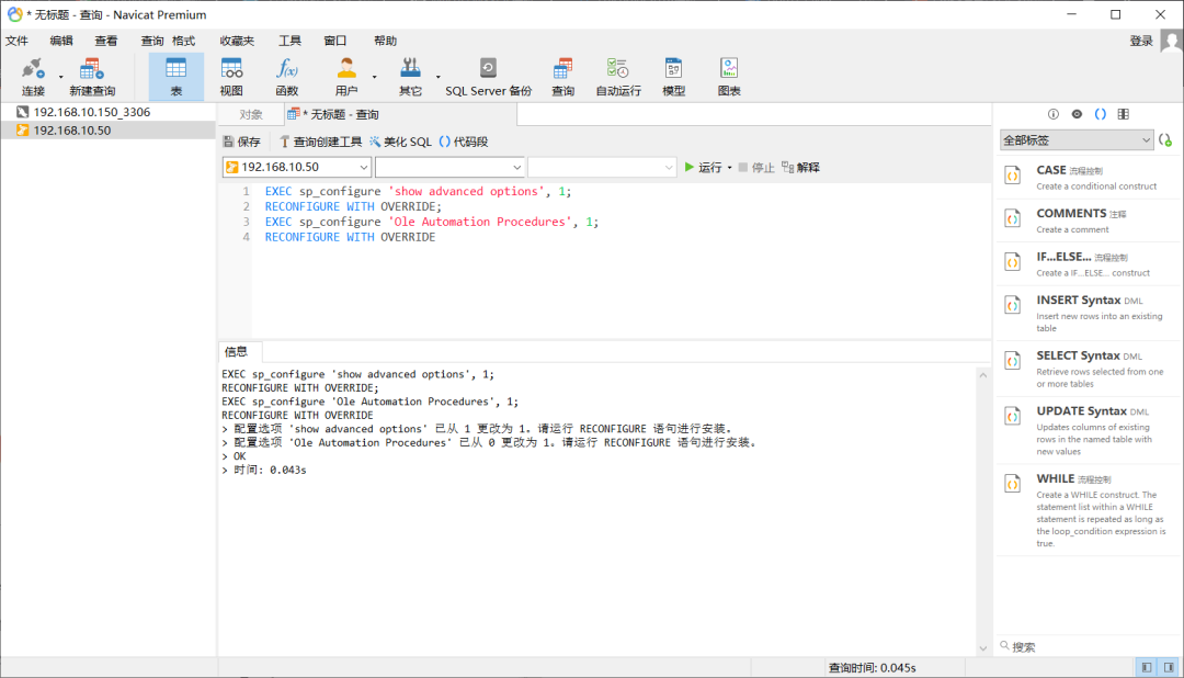 开启:EXEC sp_configure 'show advanced options', 1;RECONFIGURE WITH OVERRIDE;EXEC sp_configure 'Ole Automation Procedures', 1;RECONFIGURE WITH OVERRIDE关闭:EXEC sp_configure 'show advanced options', 1;RECONFIGURE WITH OVERRIDE;EXEC sp_configure 'Ole Automation Procedures', 0;RECONFIGURE WITH OVERRIDE;