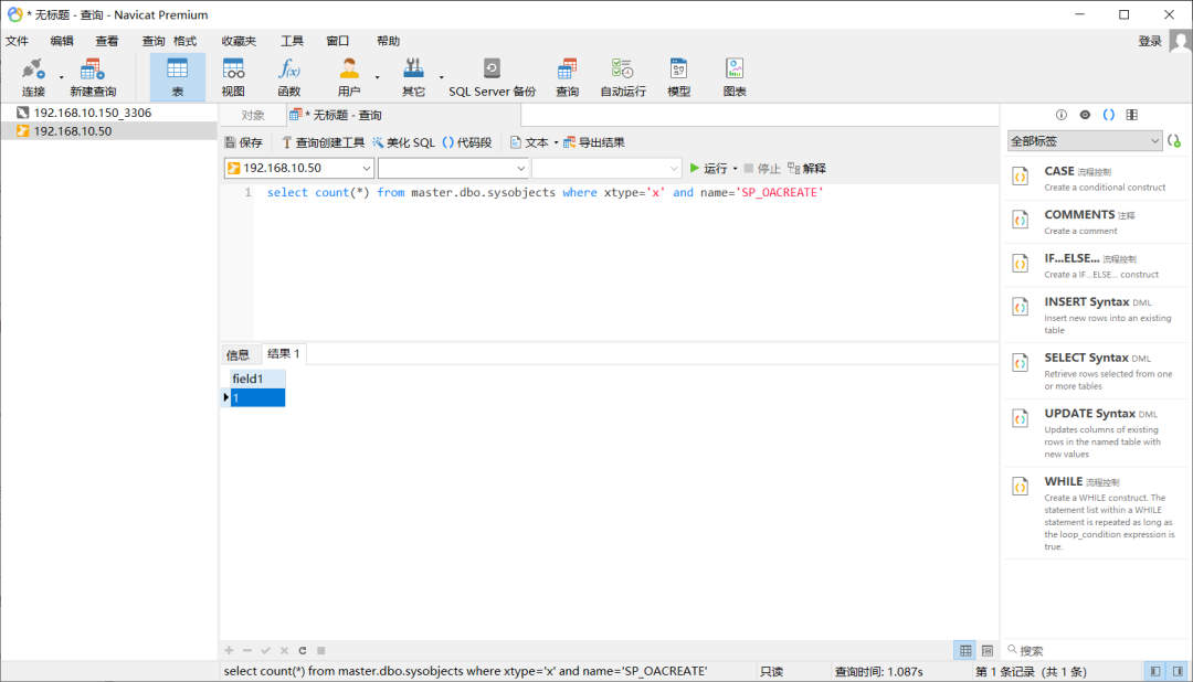 select count(*) from master.dbo.sysobjects where xtype='x' and name='SP_OACREATE'通过测试发现组件并未开启。