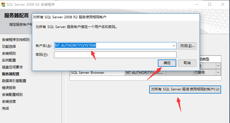 点击“对所有SQL Server服务使用相同的账户”,然后选在system账户。