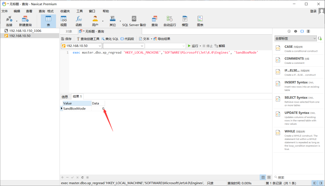 沙盒模式SandBoxMode参数含义(默认是2)0:在任何所有者中禁止启用安全模式1:为仅在允许范围内2:必须在access模式下3:完全开启查看沙盒模式exec master.dbo.xp_regread 'HKEY_LOCAL_MACHINE','SOFTWARE\Microsoft\Jet\4.0\Engines', 'SandBoxMode'