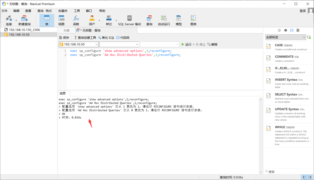 开启:exec sp_configure 'show advanced options',1;reconfigure;exec sp_configure 'Ad Hoc Distributed Queries',1;reconfigure;关闭:exec sp_configure 'show advanced options',1;reconfigure;exec sp_configure 'Ad Hoc Distributed Queries',0;reconfigure;